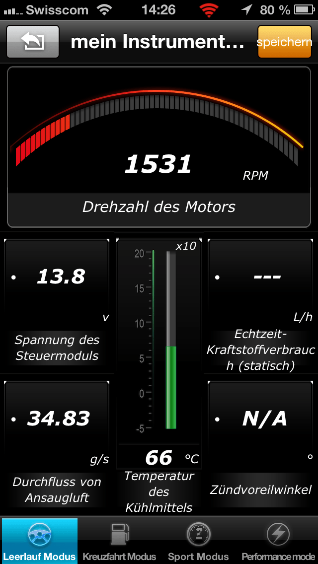 Nach einer erfolgreichen Verbindung kann ich nun diverse Dinge ausprobieren. Ganz praktisch ist das Auslesen des Fehlercode Speichers, für jeden der gerne mal was bastelt sehr praktisch. Nach beheben des Fehlers kann er auch wieder gelöscht werden. Man kann diverse Leistungstest machen, zum Beispiel auf 400m beschleunigen und die Daten erfassen. Spannend ist die Instrumentenanzeige, wo quasi alles was auf dem Instrumentenbrett im Auto auch auf dem Smartphone angezeigt wird. Eine leichte Verzögerung bei den Daten ist immer auszumachen, ich weis aber auch nicht wie hoch die Updatefrequenz auf dem OBD-Bus ist. Jedenfalls für einfach Analysen oder zum Fehlerauslesen taugt das System allemal sehr gut. Aufgezeichnete Werte können in der History abgerufen werden, es wurde an vieles gedacht. Das enttäuscht ein wenig über die vielleicht etwas lieblos gestaltete App hinweg, das soll aber niemanden vom Gebrauch abhalten.